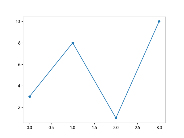 # 这三行代码使编译器能够绘图: import sys import matplotlib matplotlib.use('Agg') import matplotlib.pyplot as plt import numpy as np ypoints = np.array([3, 8, 1, 10]) # 使用五边形标记绘制 plt.plot(ypoints, marker = 'p') plt.show() # 这两行代码使编译器能够输出图形: plt.savefig(sys.stdout.buffer) sys.stdout.flush()