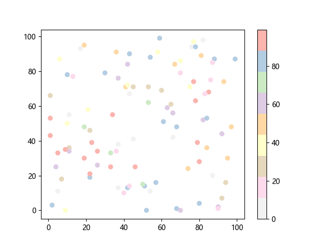 # 这三行代码使编译器能够绘图: import sys import matplotlib matplotlib.use('Agg') import matplotlib.pyplot as plt import numpy as np x = np.random.randint(100, size=(100)) y = np.random.randint(100, size=(100)) colors = np.random.randint(100, size=(100)) # 绘制反向 Pastel1 配色方案的散点图: plt.scatter(x, y, c=colors, cmap='Pastel1_r') plt.colorbar() plt.show() # 这两行代码使编译器能够输出图形: plt.savefig(sys.stdout.buffer) sys.stdout.flush()