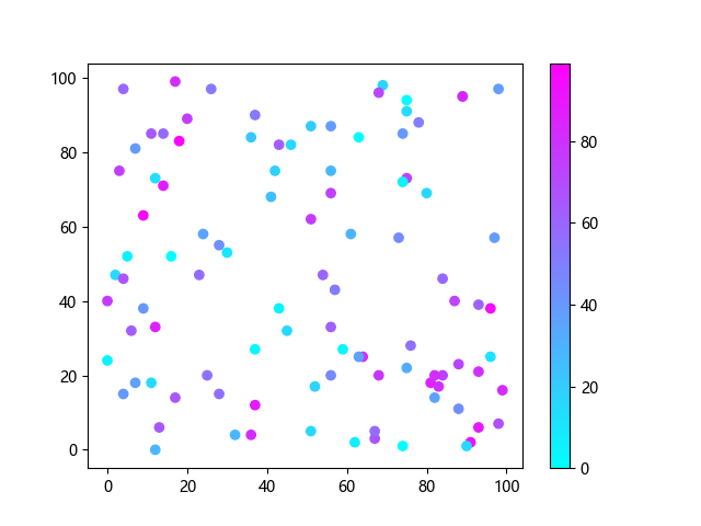 # 这三行代码使编译器能够绘图: import sys import matplotlib matplotlib.use('Agg') import matplotlib.pyplot as plt import numpy as np # 生成随机数据 x = np.random.randint(100, size=(100)) y = np.random.randint(100, size=(100)) colors = np.random.randint(100, size=(100)) # 使用 cool 配色方案绘制冷色调渐变色散点图: plt.scatter(x, y, c=colors, cmap='cool') plt.colorbar() plt.show() # 这两行代码使编译器能够输出图形: plt.savefig(sys.stdout.buffer) sys.stdout.flush()
