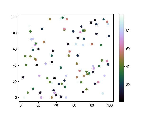 # 这三行代码使编译器能够绘图: import sys import matplotlib matplotlib.use('Agg') import matplotlib.pyplot as plt import numpy as np # 生成随机数据 x = np.random.randint(100, size=(100)) y = np.random.randint(100, size=(100)) colors = np.random.randint(100, size=(100)) # 使用 cubehelix 配色方案绘制螺旋立方体渐变色散点图: plt.scatter(x, y, c=colors, cmap='cubehelix') plt.colorbar() plt.show() # 这两行代码使编译器能够输出图形: plt.savefig(sys.stdout.buffer) sys.stdout.flush()