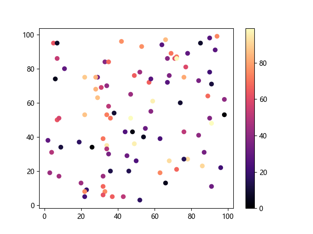 # 这三行代码使编译器能够绘图: import sys import matplotlib matplotlib.use('Agg') import matplotlib.pyplot as plt import numpy as np # 生成随机数据 x = np.random.randint(100, size=(100)) y = np.random.randint(100, size=(100)) colors = np.random.randint(100, size=(100)) # 使用 magma 配色方案绘制岩浆渐变色散点图: plt.scatter(x, y, c=colors, cmap='magma') plt.colorbar() plt.show() # 这两行代码使编译器能够输出图形: plt.savefig(sys.stdout.buffer) sys.stdout.flush()