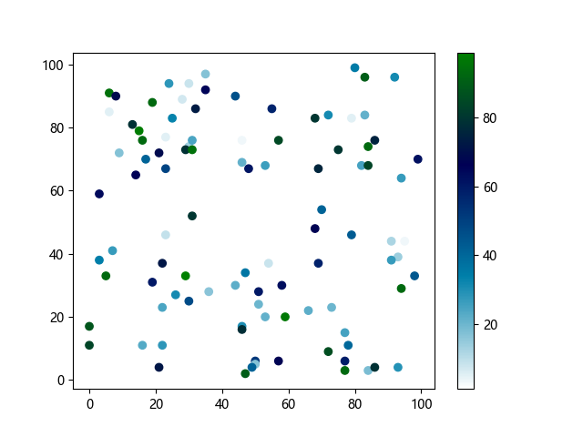 # 这三行代码使编译器能够绘图: import sys import matplotlib matplotlib.use('Agg') import matplotlib.pyplot as plt import numpy as np # 生成随机数据点 x = np.random.randint(100, size=(100)) y = np.random.randint(100, size=(100)) colors = np.random.randint(100, size=(100)) # 使用 ocean_r 配色方案绘制海洋色反向渐变色散点图: plt.scatter(x, y, c=colors, cmap='ocean_r') plt.colorbar() plt.show() # 这两行代码使编译器能够输出图形: plt.savefig(sys.stdout.buffer) sys.stdout.flush()