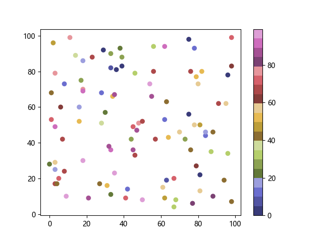 # 以下三行代码使编译器支持绘图功能: import sys import matplotlib matplotlib.use('Agg') import matplotlib.pyplot as plt import numpy as np # 生成随机数据: x = np.random.randint(100, size=(100)) y = np.random.randint(100, size=(100)) colors = np.random.randint(100, size=(100)) # 使用 tab20b 离散配色方案创建散点图: plt.scatter(x, y, c=colors, cmap='tab20b') plt.colorbar() plt.show() # 以下两行代码使编译器能够输出图形: plt.savefig(sys.stdout.buffer) sys.stdout.flush()