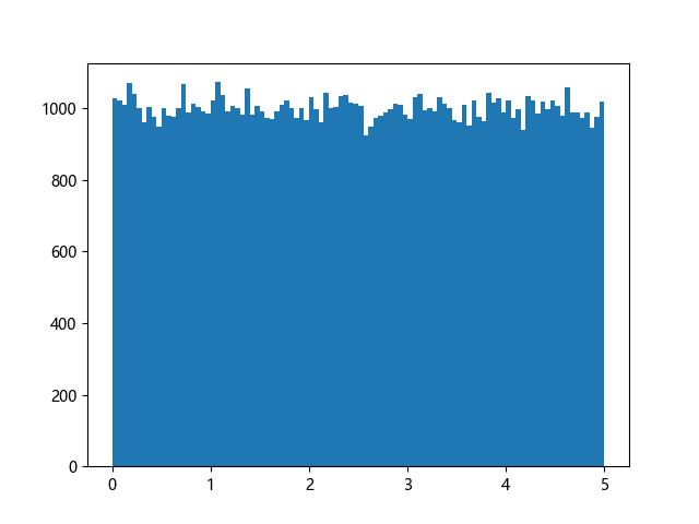 # 使编译器支持绘图的三行配置: import sys import matplotlib matplotlib.use('Agg') import numpy import matplotlib.pyplot as plt x = numpy.random.uniform(0.0, 5.0, 100000) plt.hist(x, 100) plt.show() # 实现编译器绘图功能的两行代码: plt.savefig(sys.stdout.buffer) sys.stdout.flush()