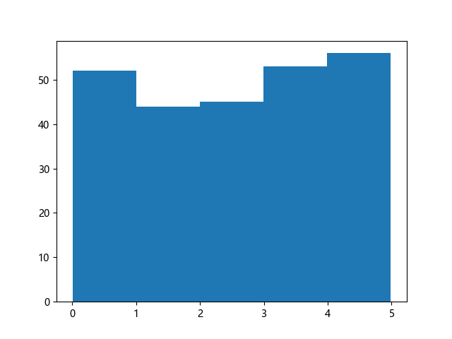 # 使我们的编译器能够绘制的三行代码: import sys import matplotlib matplotlib.use('Agg') import numpy import matplotlib.pyplot as plt x = numpy.random.uniform(0.0, 5.0, 250) plt.hist(x, 5) plt.show() # 使我们的编译器能够绘制的两行代码: plt.savefig(sys.stdout.buffer) sys.stdout.flush()