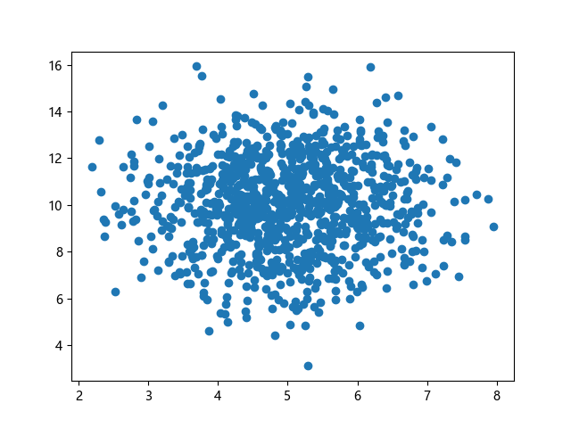 # 三行配置使编译器支持绘图功能: import sys import matplotlib matplotlib.use('Agg') import numpy import matplotlib.pyplot as plt # 生成正态分布数据:x~N(5.0,1.0),y~N(10.0,2.0),各 1000 个样本点: x = numpy.random.normal(5.0, 1.0, 1000) y = numpy.random.normal(10.0, 2.0, 1000) # 绘制散点图 plt.scatter(x, y) plt.show() # 两行代码实现图形输出: plt.savefig(sys.stdout.buffer) sys.stdout.flush()